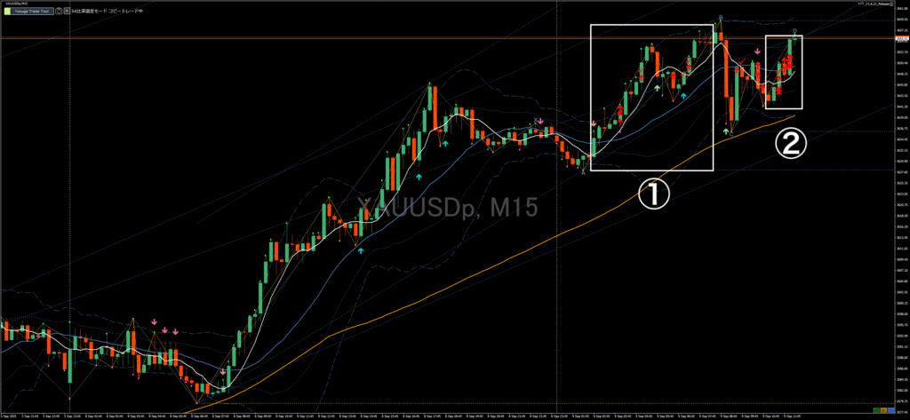 ・現在足(15分足で主チャートとして使用、トレードエントリー&決済の基準に使用)